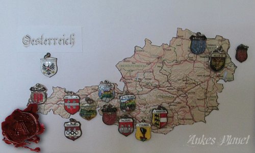 Letztes Jahr hat es mich aber wieder gepackt und ich habe meine Wappen aus ihrem Kästchen befreit und in Bilderrahmen an die Wand gehängt. Jedes einzelne an seinem Platz auf der Karte.